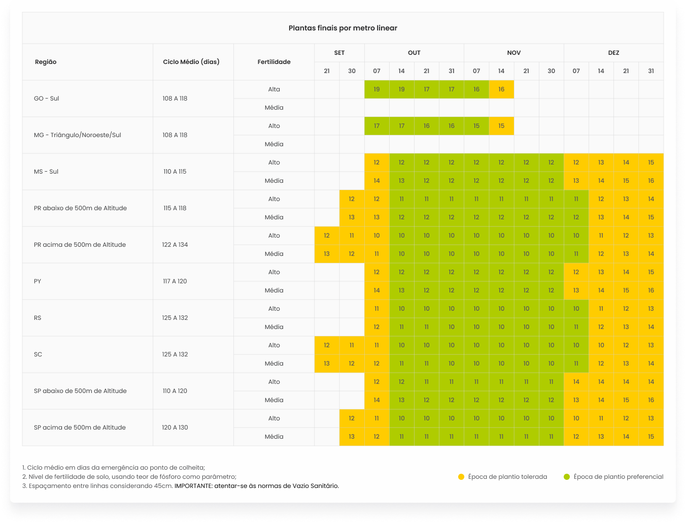 Alto teto produtivo, ampla adaptabilidade e boa plasticidade em relação ao estande de plantas. Boa sanidade foliar.