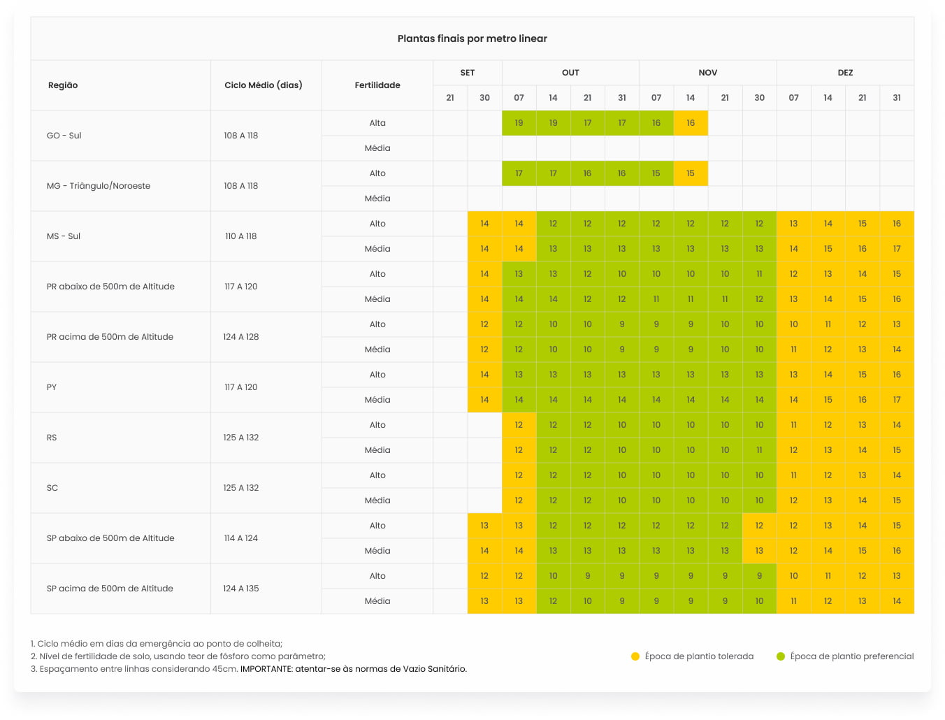 Alto potencial produtivo com estabilidade produtiva, resistente à ferrugem asiática e permite plantio de milho segunda safra.
